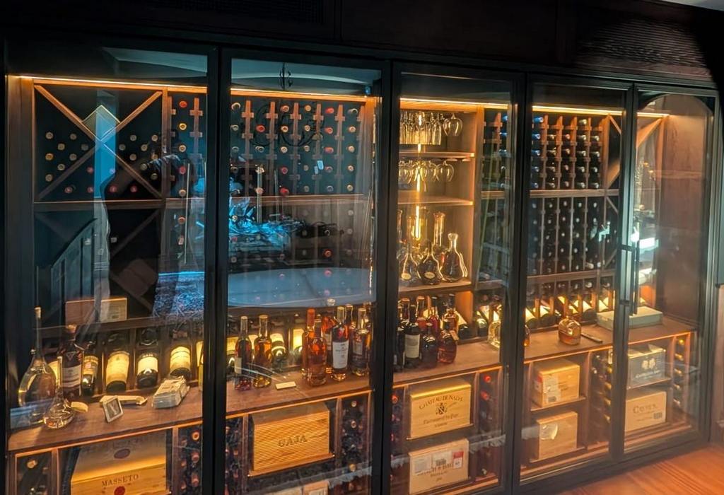 The result is a sleek, fully enclosed refrigerated wine wall that combines elegance with functionality. The combination of walnut craftsmanship, bronze detailing, and custom lighting creates a luxurious showcase, while the Fondis system ensures optimal wine preservation.
