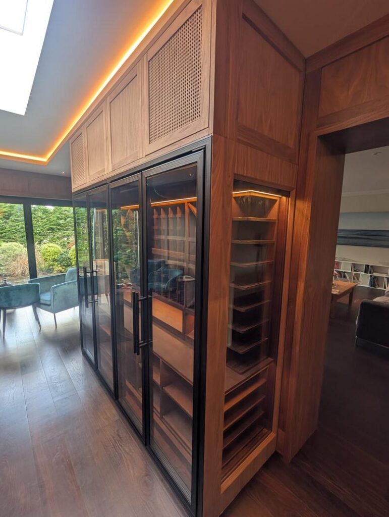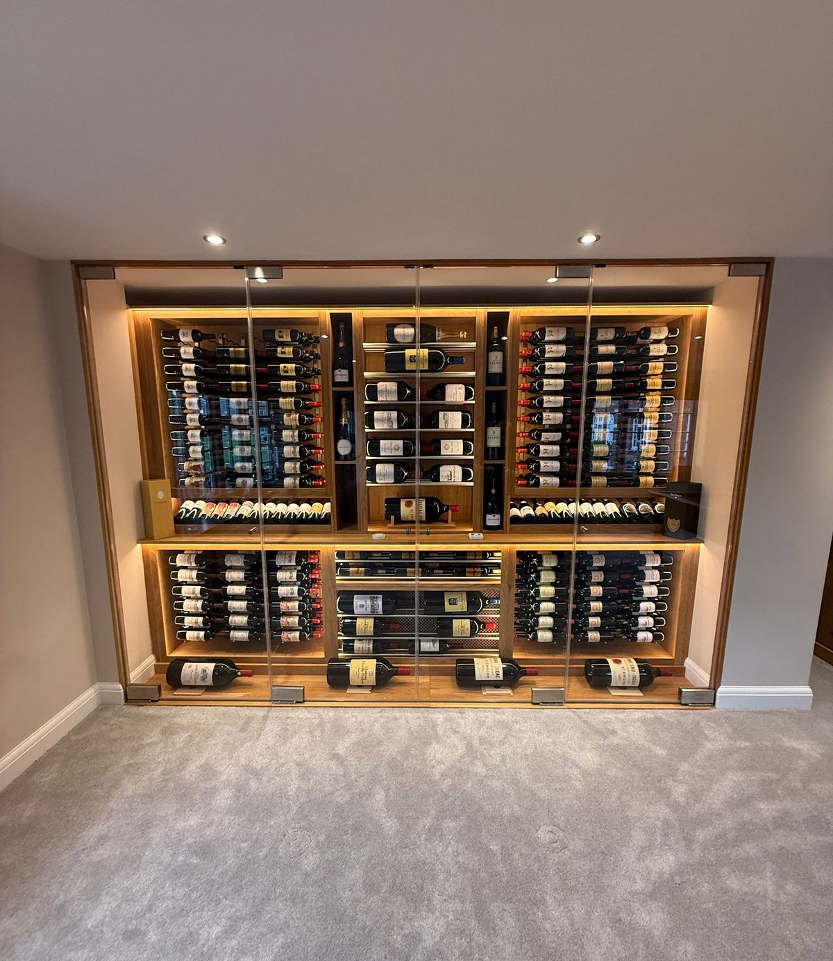 Our typical wine wall design and build service, is basic on our UK manufacturer solid wood modular approach. This means it can be hugely flexible, and perfectly configured for your property and preferences.