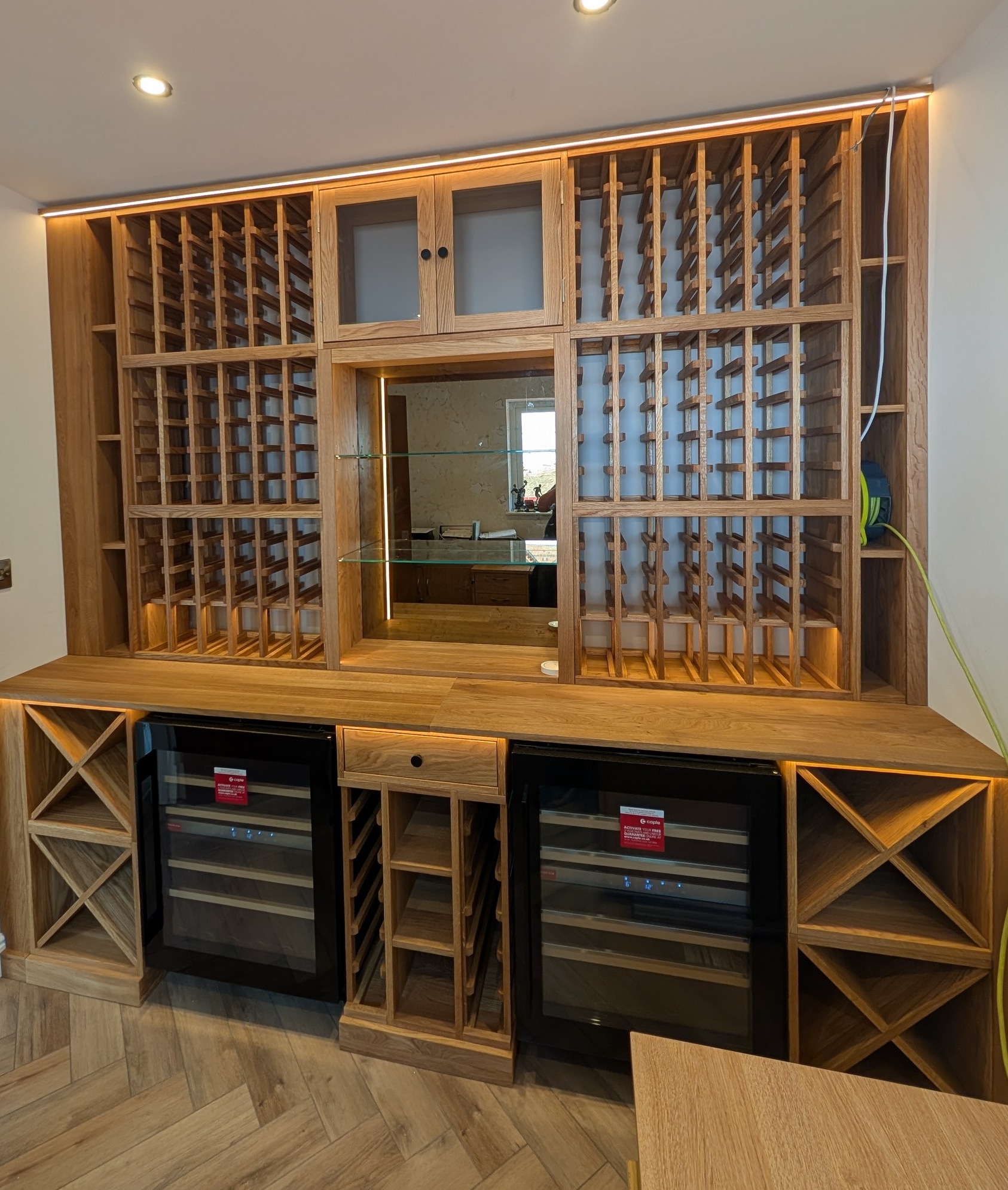 "Wine wall in oak with Danish oil finish. 2.5metres long by 2.1metres high. Include two 600 high wine fridges, LED lighting and fitting"